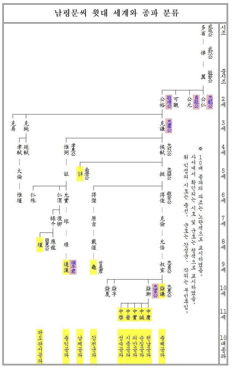 세계표(世系表)는 세수와 이름만을 적은 가장 간단한 족보의 한 표현 방식입니다. 이는 족보의 내용을 생략하여 간단하게 윗대를 알고 분파를 알기 위함입니다. 남평 문씨 10대 종파 파조 윗대의 세계표는 다음과 같습니다