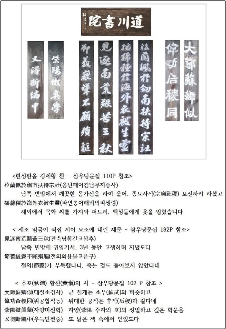 선생의 덕택이다. 그런데도, 선생을 논(論)하는 세상 사람들은 반드시 옷을 입혀 준 공을 말하고, 학문과 충효에 있어서나 유학을 위함을 자신의 책임으로 삼으시고 세상의 풍습(風習)이 잘 되게 도와 우리 이씨조선 오백 년 간의 문명적 정치를 열어 주신 것에 대해서는 어둡기도한데, 이는 역시 선생을 알음이 얕기 때문이 아니겠는가? 그렇지 않다 후직은 순임금의 신하 다섯 사람 중의 하나로 성인의 짝이 될 수 있는데도 시경(詩經) 서경(書經)에 말해져 있음은, 한결같이 우리들을 먹인 공(功)에 대해서만 찬양하고 감탄하였다 선생이 우리들에게 옷 입힌 공은, 다만 이 나라 백성으로 하여금 춥지 않게 했을 뿐에 그치지 않고, 실로 되놈의 풍속을 고치게 할 바탕이 되셨으니 아, 잊을 수가 있겠는가? 잊을 수가 없는 것이로다. 강성(江城)은 선생께서 태어나신 고향이다. 서원을 도천(道川)에 세워 고을 사람들이 제사를 올려 높이 받들고, 조정에서는 현판을 내리시어 표창을 하셨는데, 이제는 제사를 폐(廢)하고 서원은 빈터만 있게 되었다. 고을의 선비들은 사모하는 마음 붙일 곳이 없어지자, 노산(蘆山)의 기슭에 자리를 잡아 수간의 정사(精舍)를 짓고 창주정사(滄洲精舍)의 제사 지내는 의식을 대체로 모방했다. 노산은 선생의 묘가 있는 곳이다. 정사 건립에 대한 사실은 기록 중에 자세히 말해 있다. 벗 권상적(權相迪)이 실질적으로 이 일을 주관했고, 죽은 내 아들 회근(晦根) 또한 처음부터 끝까지 같이 거들었다. 이런 고로, 고을 사람들이 내게 한 마디 말을 뒷사람들에게 남겨둬 달라고 부탁하는 것이었다. 나는 생명이 없는 것과도 같이 병고(病苦)를 오래 겪고 있는 처지인데 차마 말을 하랴. 그러나 고을 사람들의 부탁을 거듭 어기었고, 또 세상이 천했던 사람들이 교만을 부리고 우리나라 사람으로 선생한테 은혜를 받은 사람들이 벌벌 떨어 몸을 가누지 못할 것 같은지라 아픔을 참고 분수에 넘는 것을 잊고서 감히 한 마디 말을 하여 이 곳에 와 놀고 쉬는 이들에게 고(告)하노라, 원컨대, 제군(諸君)은 충효로 근본을 세우고 학문을 하여 일을 하신 바를 잊지 말라. 그러면 곧 좋지 않으리오. 정말 좋지 않으리오. |