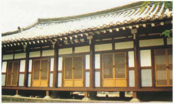 장흥군수 이장용(李章鎔)이 향교 유생들의 협조로 가지산(迦智山)의 소나무와 수인산(修仁山)의 잣나무로 중건한 강당은 앞면 5칸 옆면 2칸의 규모로 팔작지붕 |