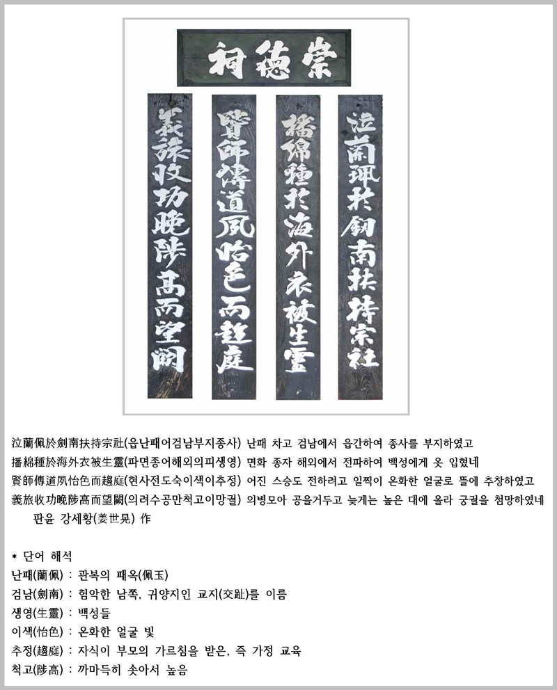 옛날 전조 고려(高麗) 때에, 사신 모시고 원(元)나라로 들어가셨다. 그 때 원의 순제(順帝)는, 공을 궁궐 안으로 불러들이고, 공민왕을 폐하겠다고 선생에게 묻는 것이었네. 선생 정색하시고 죽음으로써 안 된다고 항거하시기를 "군신은 천지와 같이 분명히 나누어집니다. 신(臣)은 명을 받들 수 없으니 형벌을 내리십시오 라고 말했네. 그래서 남방의 먼 땅으로 귀양을 가, 거의 죽을 극형을 당하셨네 3년 고생을 이겨내고, 나라의 고향 강성(江城)으로 귀환하셨다. 좋은 목면꽃 있자, 길가에서 입수하시고, 붓대 속에 감추어서 결국 우리 나라에 심어 퍼뜨렸도다. 백성들에게 옷을 입히시니, 그건 만세에 유익되었네. 벼슬에서 물러나 방장산하(方丈山下)에 살으시며,도의를 부르짖어 밝히시었다. 어버이 섬김에 효도가 지극하여 묘를 3년 지키시니, 그 모습 본 섬의 되놈 감복을 하였기에, 고을이 다 온전히 보전되었도다. 도천(道川)에 사당 지으니, 세조 임금의 은택(恩澤)이로세. 이 사당에 풍암(楓蓄)1)을 같이 모시고, 강성사(江城祠)의 현판을 내리시었다. 아, 아름다운 일이로다. 이 에 삼가 고하오니 이다. |